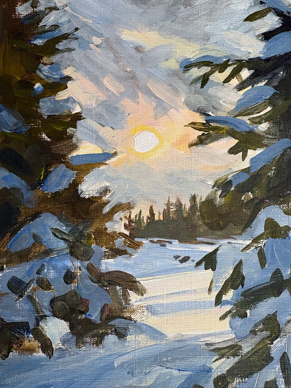 Midwinter Sun captures the serene beauty of a snowy day. Soft snow covers the trail, with the sun casting gentle hues and the forest showing rich purple shadows. Experience winter's quiet magic through Holly Friesen's art, reflecting her love of nature and the Canadian wilderness. Enjoy winter's gentle power with this beautiful artwork from Holly Friesen.